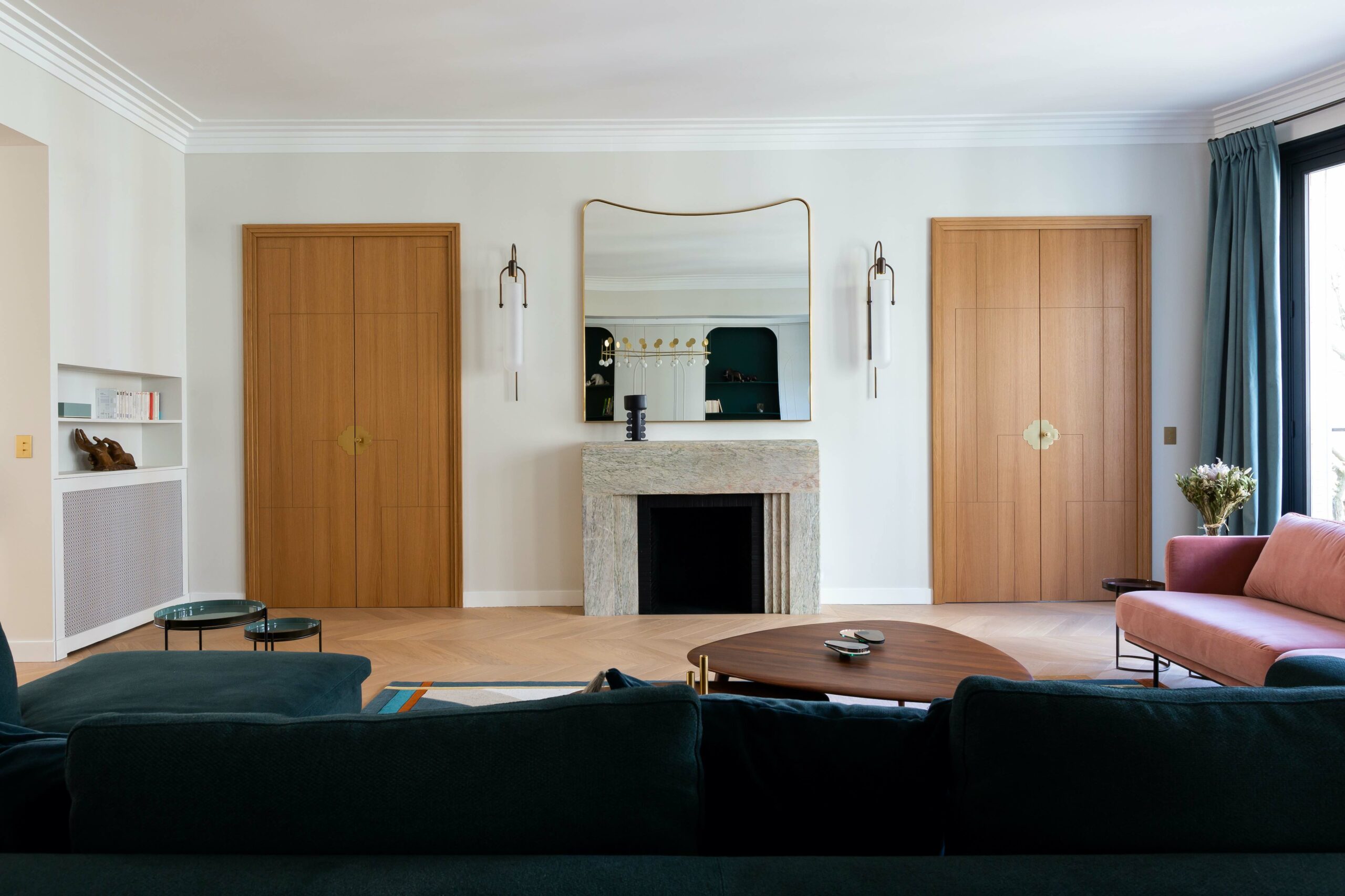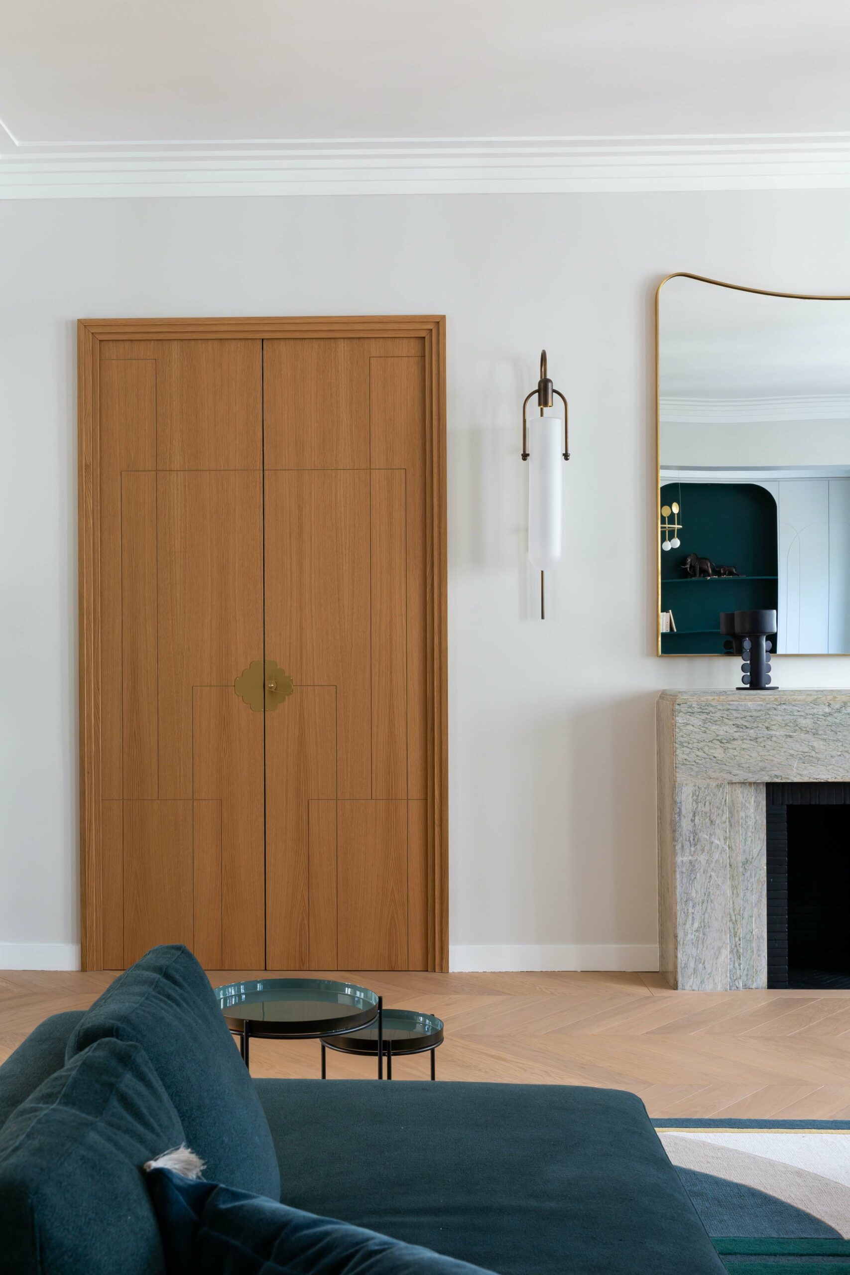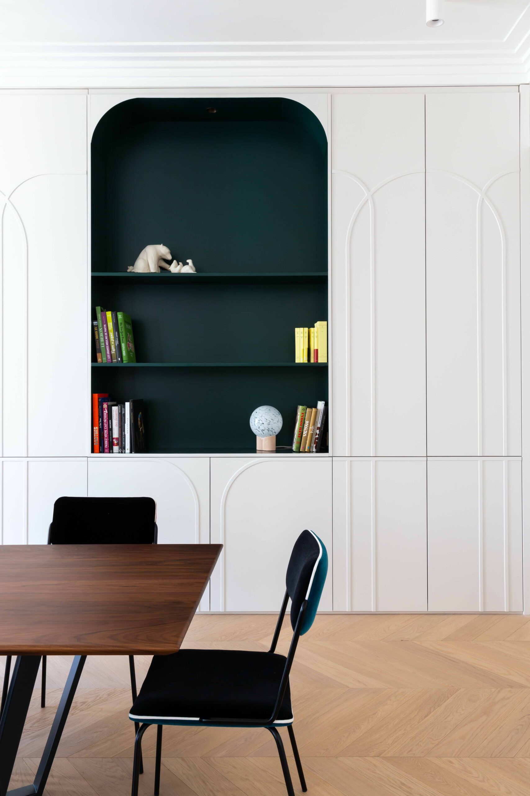 Etabli dans un bel immeuble des années 30, cet appartement avait perdu son cachet art déco. Le but de la rénovation s’est porté sur le fait de lui redonner ses lettres de noblesse. Chaque détail s’est inspiré d’un élément existant de l’immeuble ou d’inspiration 30.