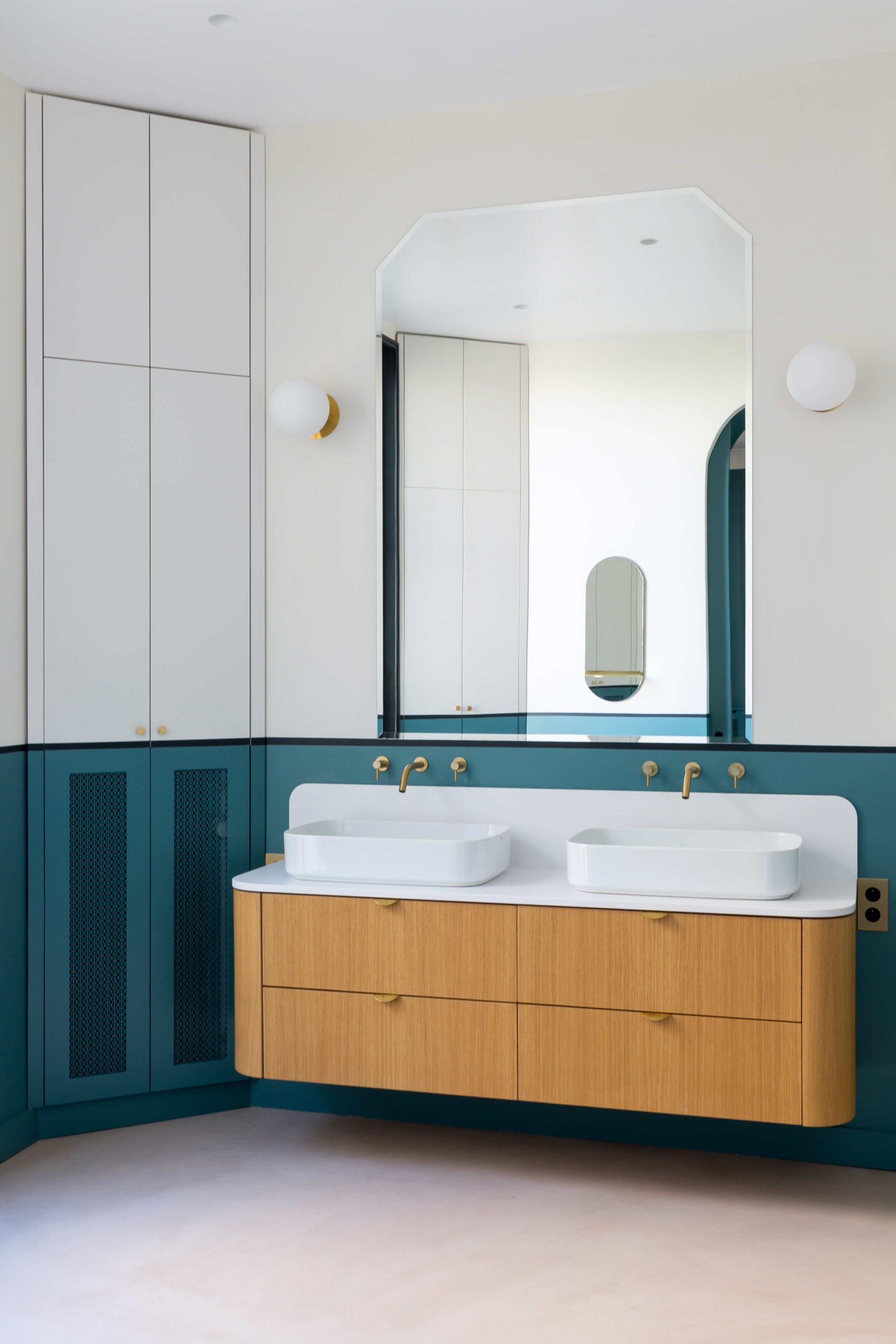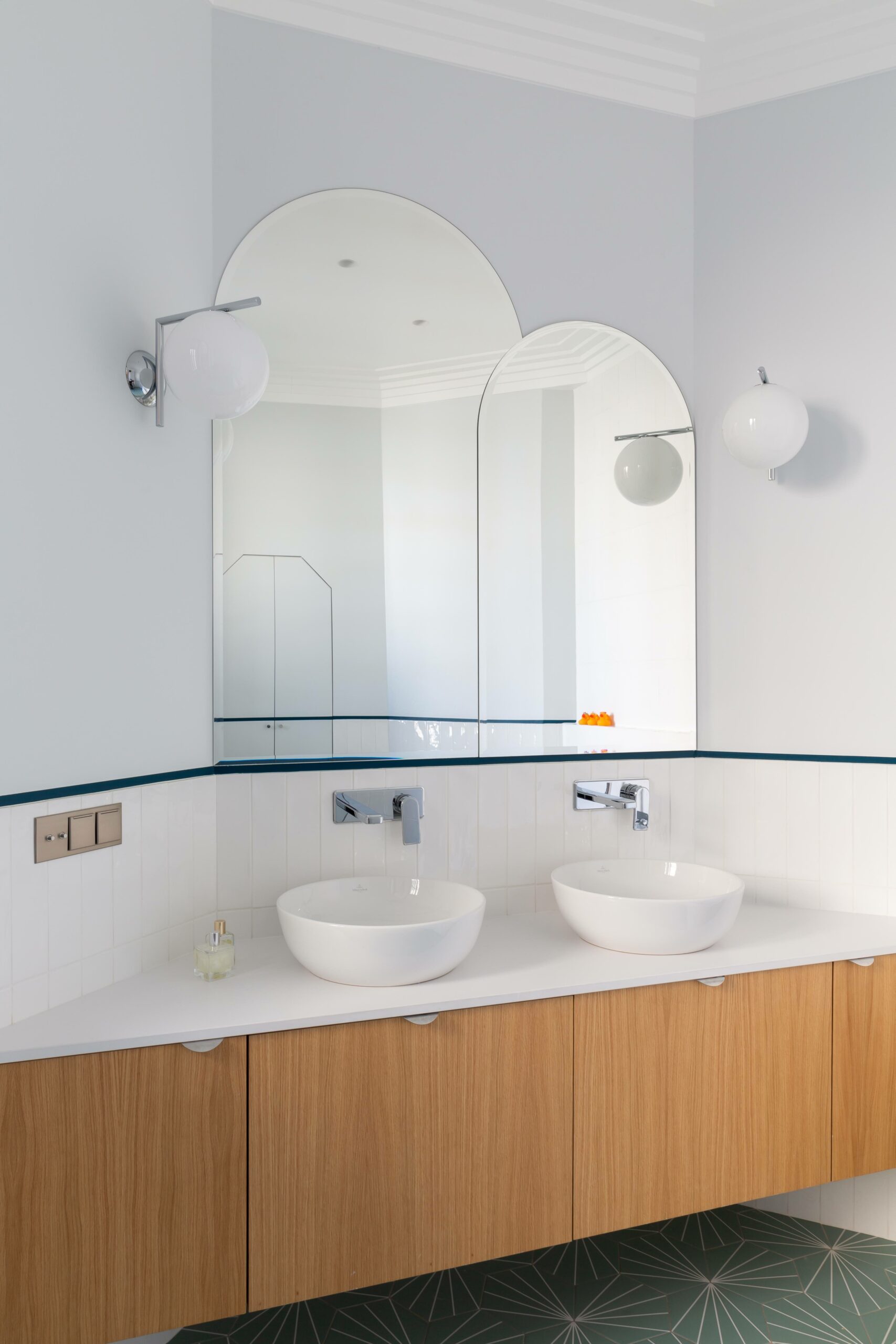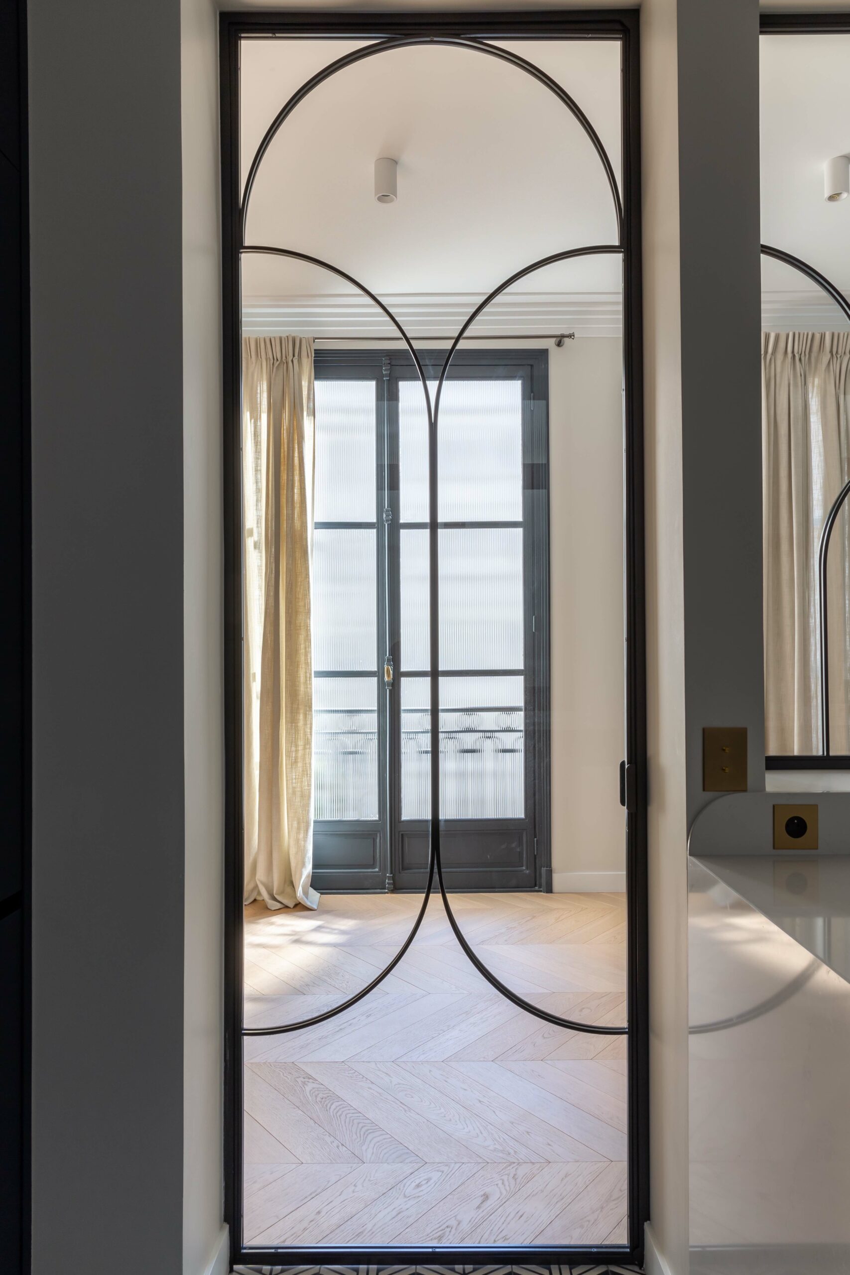 Tout ici a été dessiné par l’agence comme les tables, miroirs verrières courbes ou encore les interrupteurs personnalisés.
