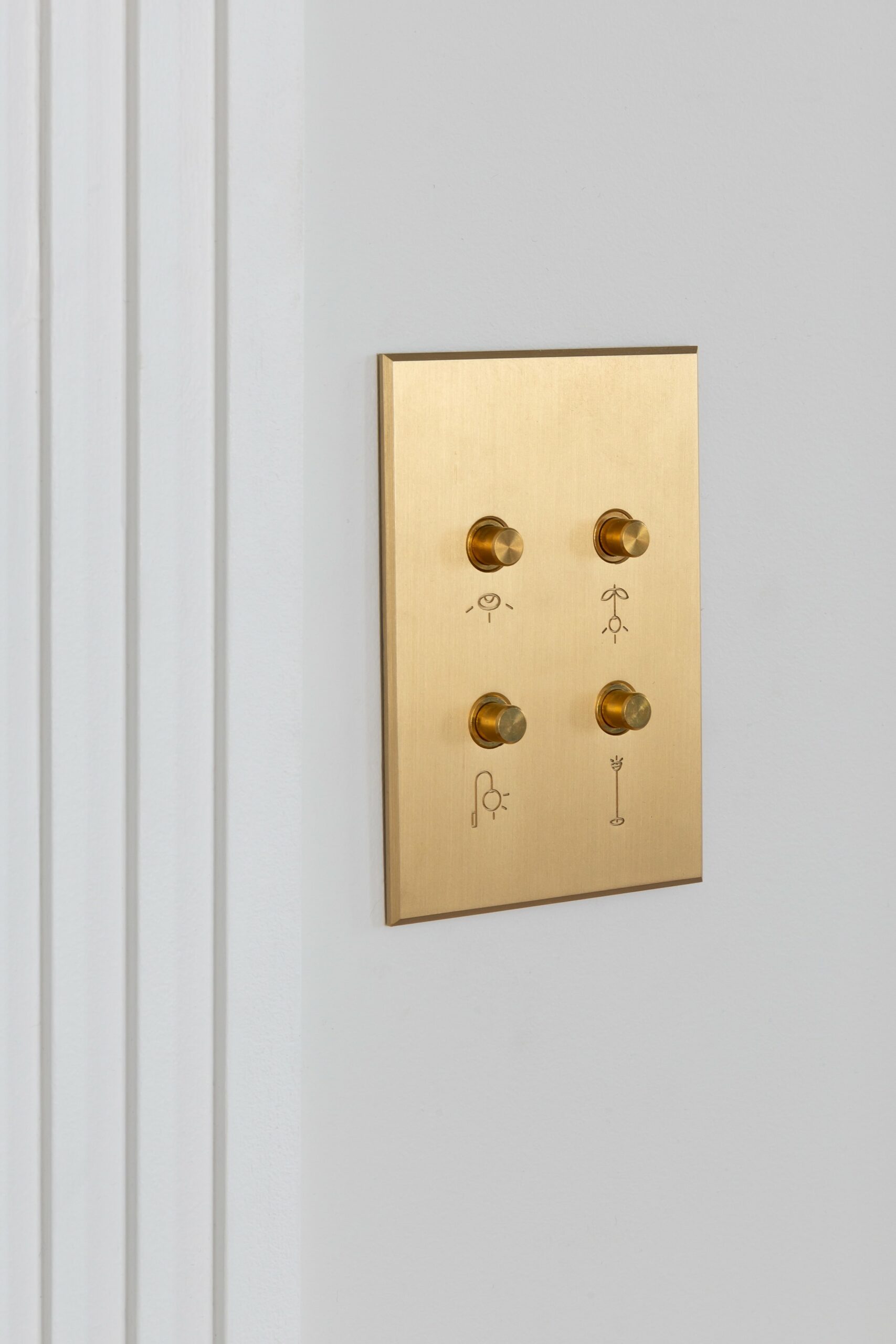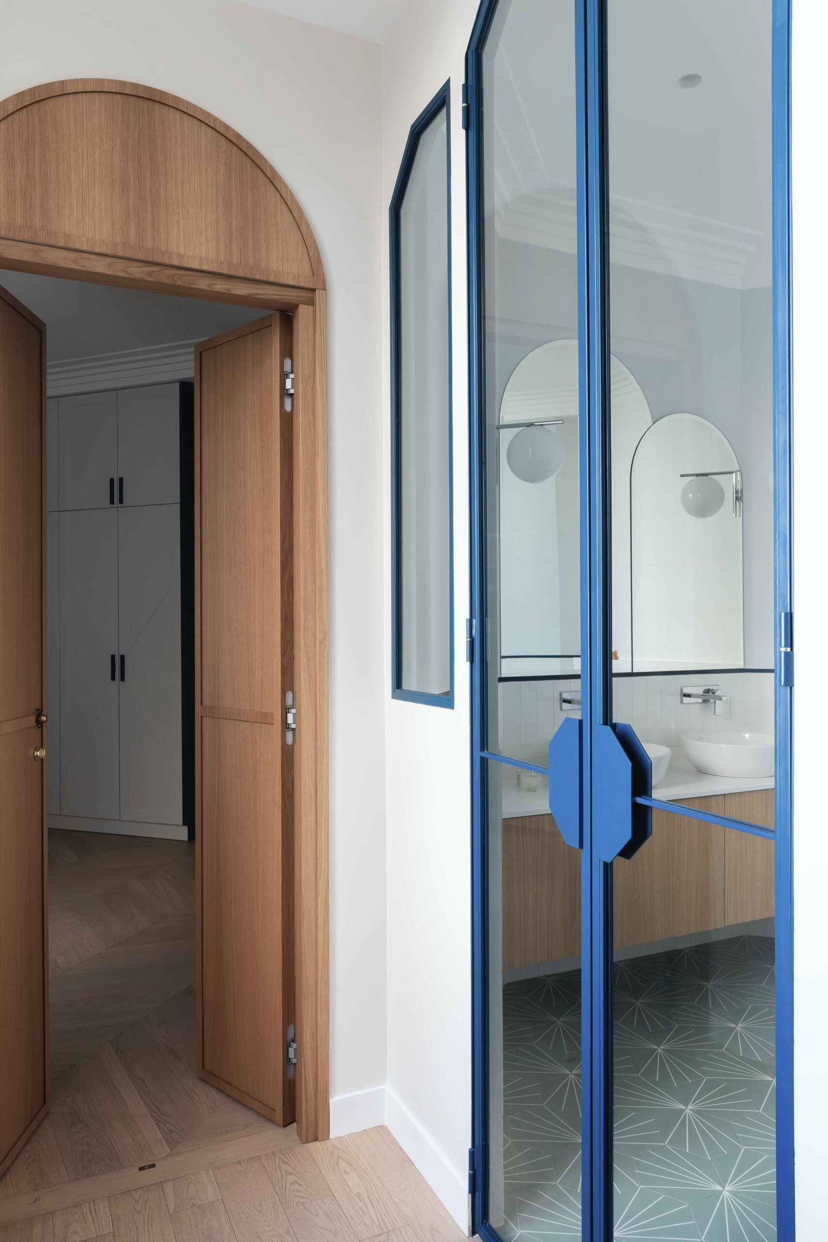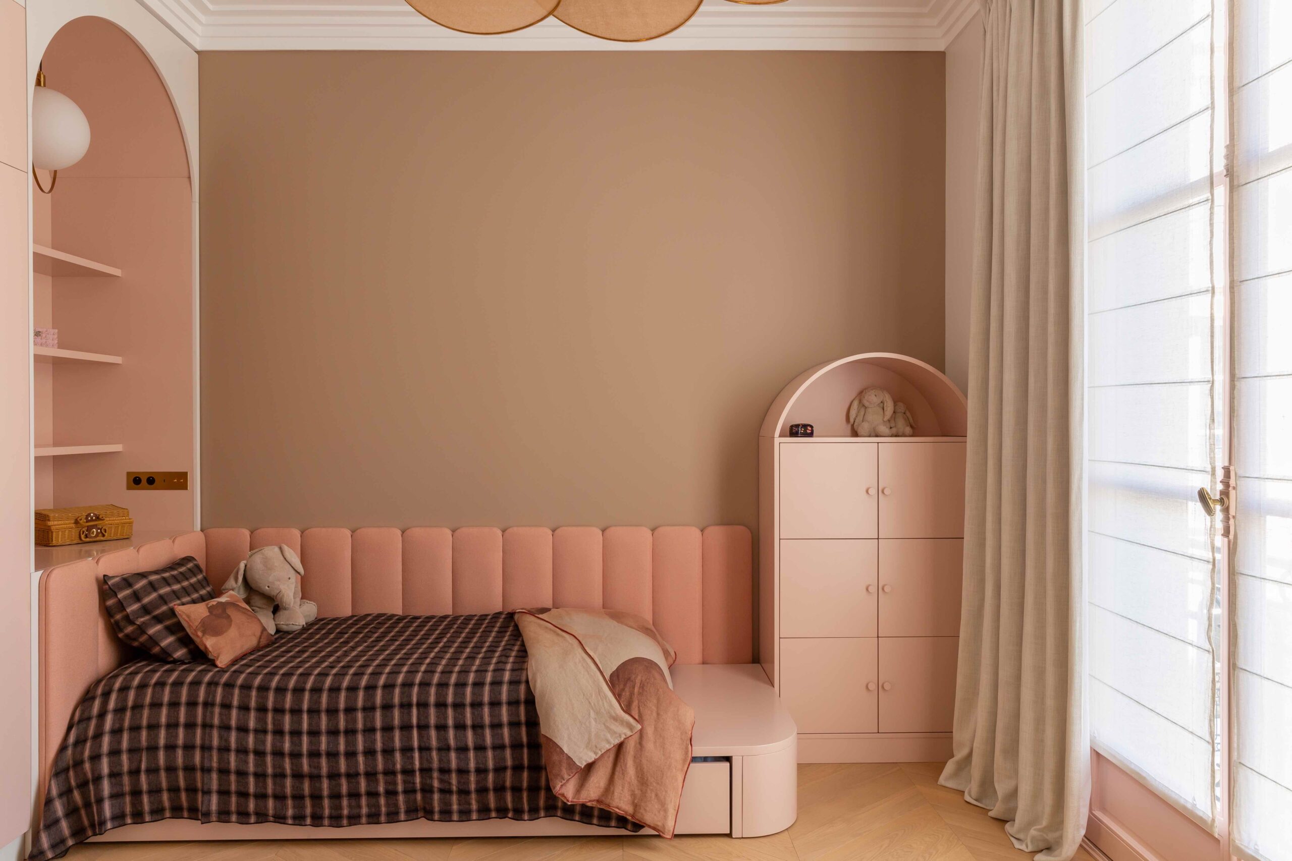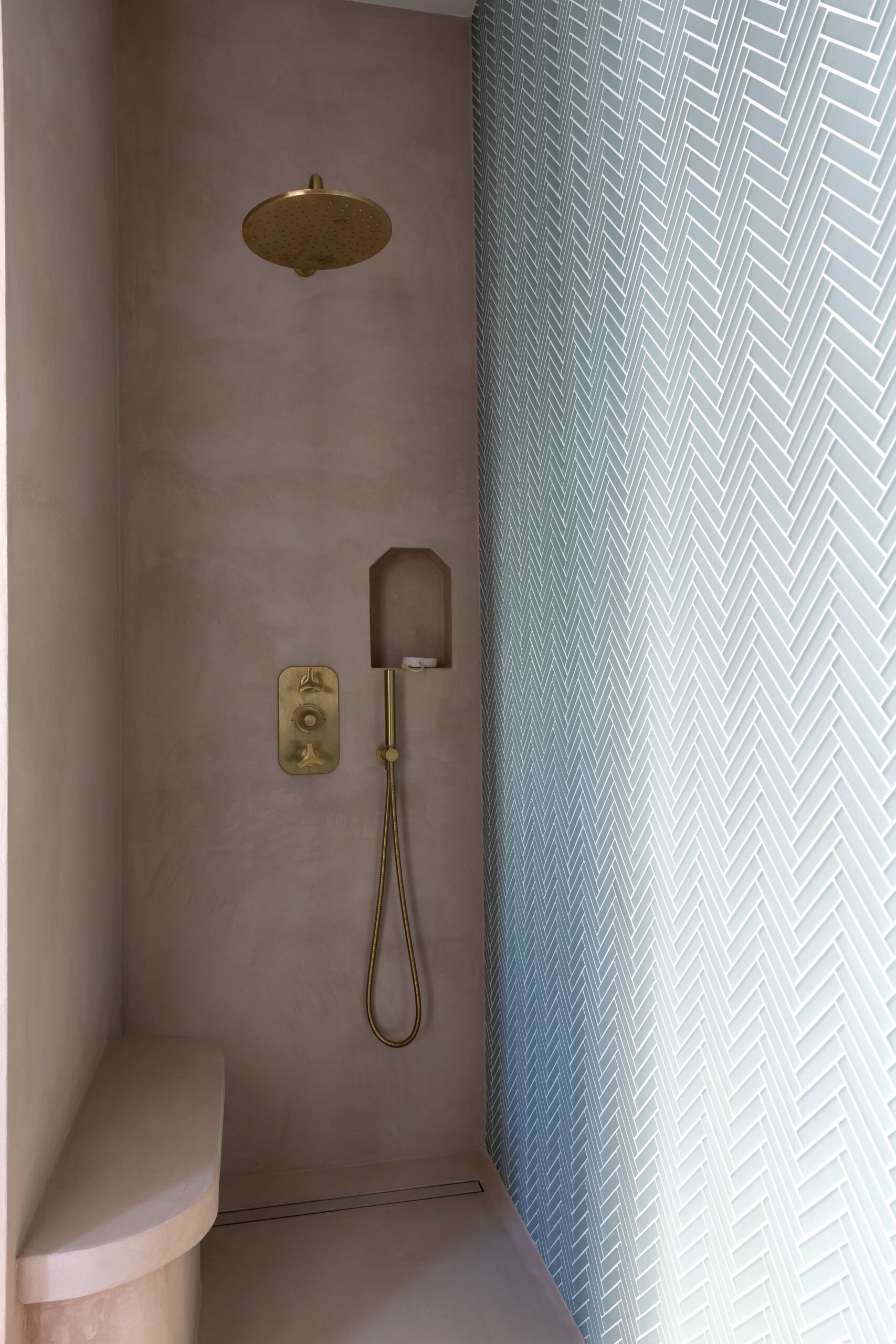 Tout ici a été dessiné par l’agence comme les tables, miroirs verrières courbes ou encore les interrupteurs personnalisés.